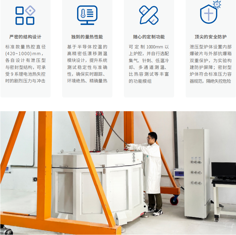 为适应锂电池单体向大体积与高比能量发展的趋势,仰仪科技推出全球首创的BAC系列全尺寸超大型电池绝热量热仪,系列定制型号量热腔直径可达1000mm以上。仰仪科技BAC系列全尺寸大型电池绝热量热仪可针对长边≤1500mm范围内的电芯开展安全、精准、可靠的绝热热失控测试。与目前国内外厂家的标准产品相比,BAC系列具有更大的量热腔容量、更高的安全防护和更丰富的测试功能。电池绝热量热仪可用于大容量和大尺寸电池单体热稳定性测试、热失控电池产气测试、材料热安全性测试、充放电产热测试、热物性参数等关键数据的测量,为锂电池热安全和热管理提供科学的参考依据。