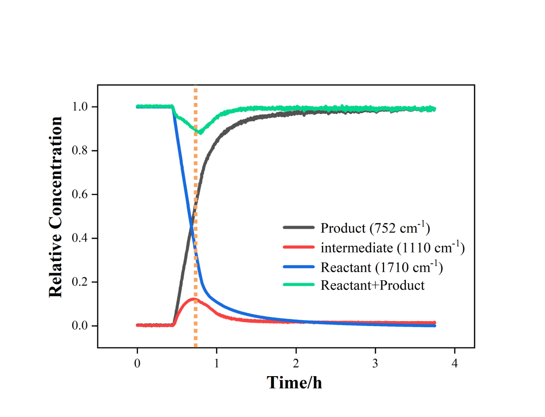 本实验以2,5-己二酮为底料、滴加乙醇胺的方式进行Paal-Knorr吡咯合成。利用ICPA技术平台分子光谱(中红外)原位检测功能,可表征反应过程中体系红外吸收光谱随时间变化。通过对全谱图进行基线校正和特征峰趋势分析,可以识别出反应体系各组分浓度的变化,其中波数1110 cm-1处的吸收峰呈现先上升后下降的趋势,且符合仲胺基上C-N键的伸缩振动峰位置,可初步识别为半缩醛胺中间体的特征峰。