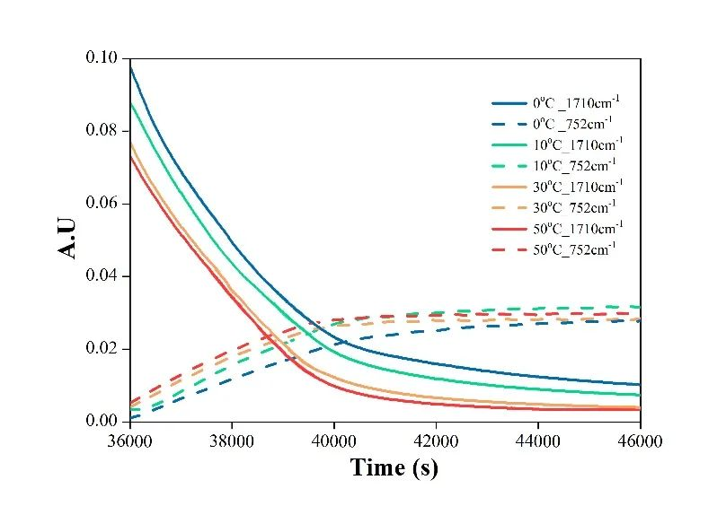 在0℃、10℃、30℃、50℃的等温条件下进行间歇式反应,反应过程中原位采集体系红外光谱,获得1710 cm-1和 753cm-1吸收峰的强度随时间变化数据。结果如下图所示:
