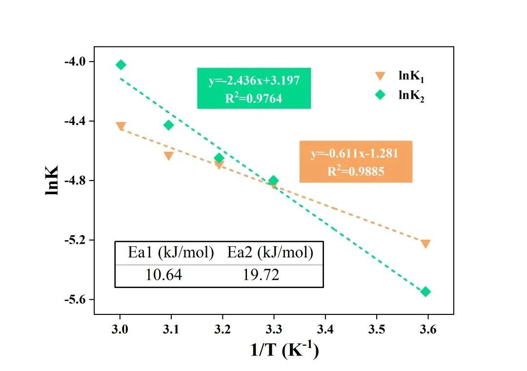 进一步根据阿伦尼乌斯方程lnk=lnA-Ea/RT对lnk与1/T进行线性拟合,可计算得到表观活化能Ea1和Ea2,结果如下图所示: