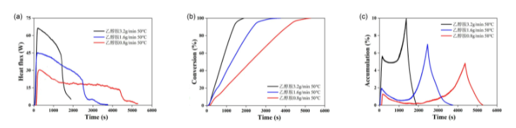 图8 (a)反应放热、(b)转化率和(c)物料积累随反应时间变化