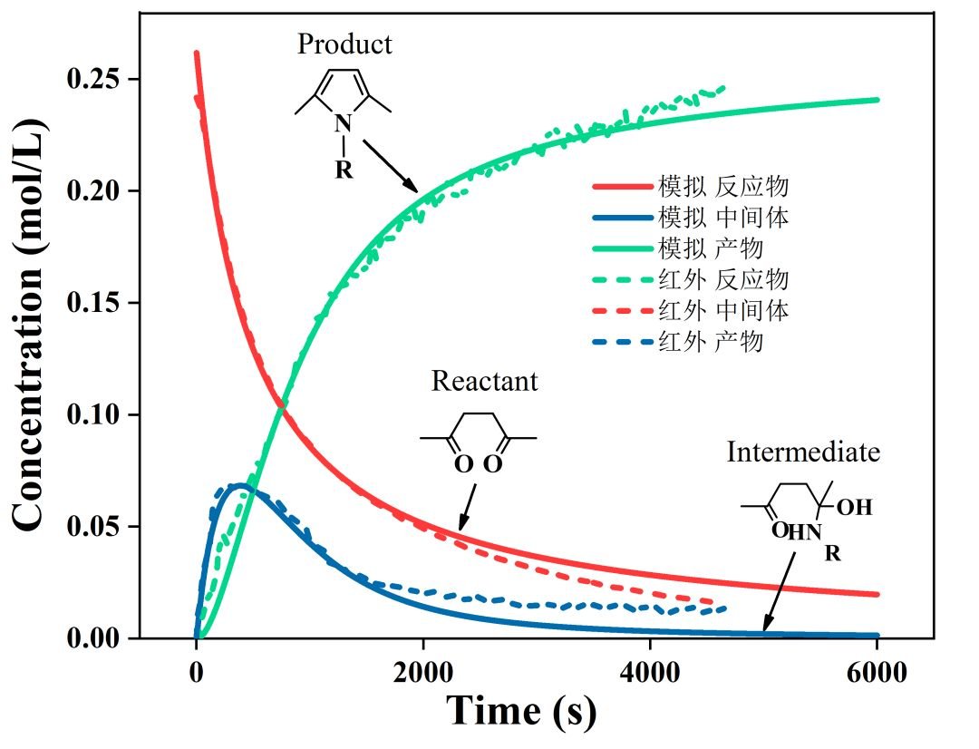 反应动力学研究,如动力学参数计算通常需要获取等温反应过程中组分浓度随反应时间变化数据。常规的操作流程为取样、样品预处理及色谱定量,这类离线检测方法不但操作复杂,同时组分的浓度分析、时间控制等存在一定误差。特别是针对反应速率较快、不易淬灭的反应,如本案例采用的乙醇胺和2, 5-己二酮的Paal-Knorr反应,离线定量的准确性受到严重制约。