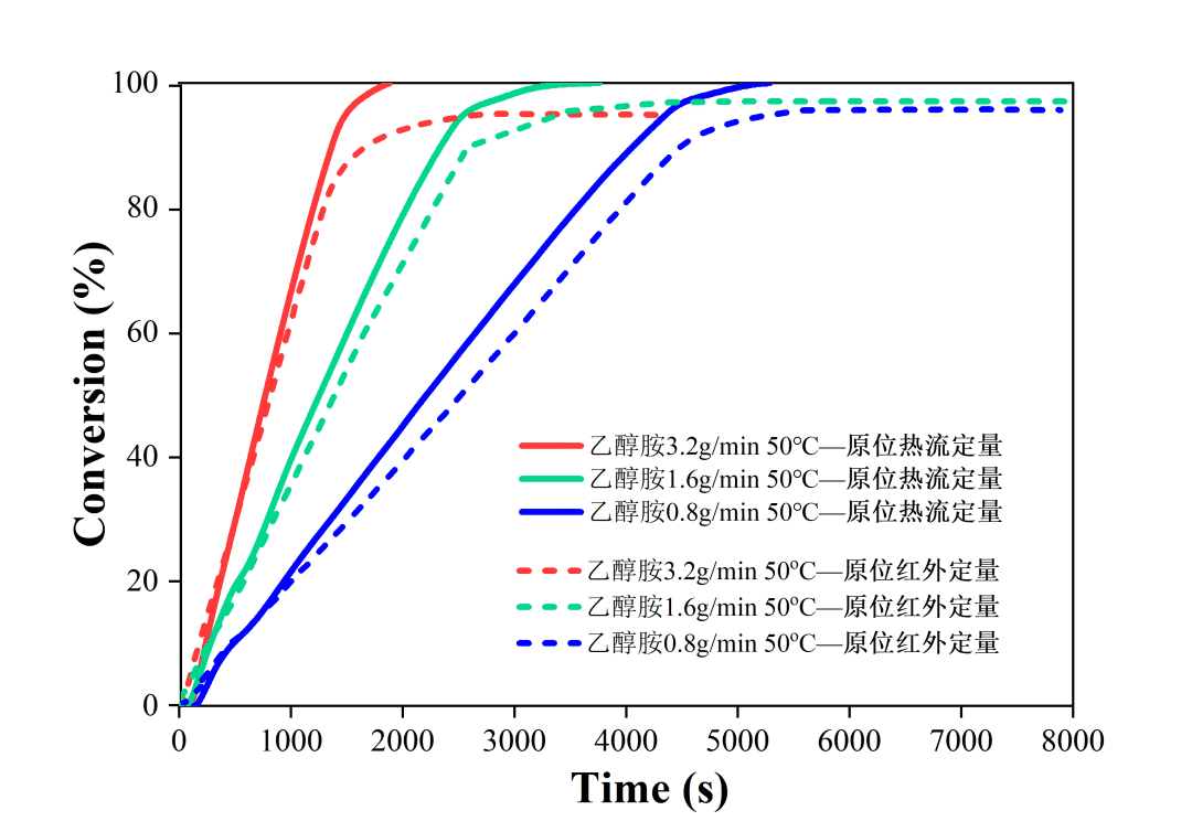 我们将通过红外与在线量热分别计算得到的转化率曲线进行对比,可以发现两者非常接近。可以认为前者代表了反应物转化率变化,后者代表了反应完成度变化,均可以体现反应的动力学特征。理论上,化学反应转化率越高,两者的差异越小。