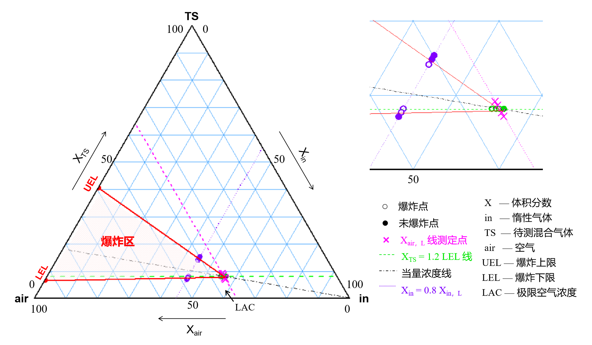 极限氧浓度可利用三元图进行分析,根据GB/T 38301-2019,当UEL≤ 0.8 × (100-Xair,L),适用简易实验程序。