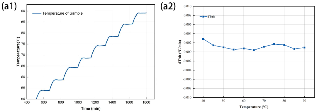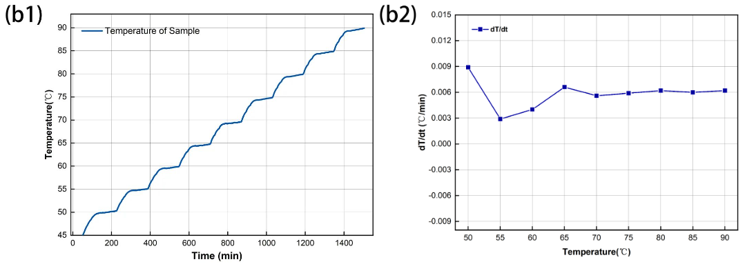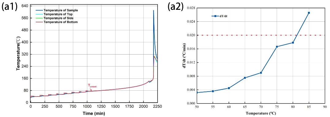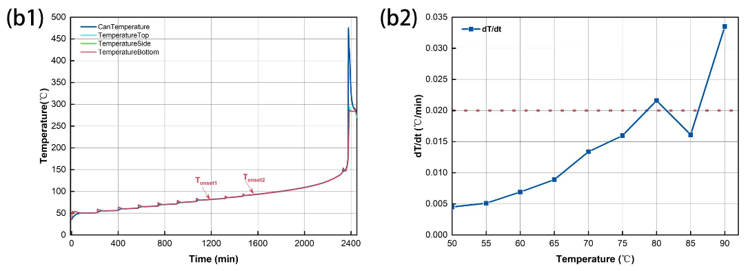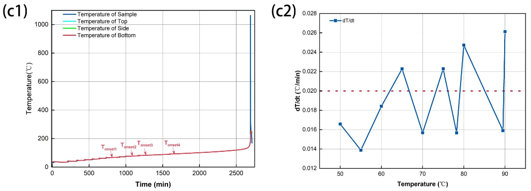 3) 只存在一个Tonset温度。图7b出现2个Tonset,上述现象有一定概率会发生,可能与SEI膜分解和再生的动态平衡有关,但更可能是校准文件不理想带来的结果;图7c使用图4c的校准文件进行测试,相邻台阶的温升速率无规波动,可能出现多次检出Tonset的反常结果。