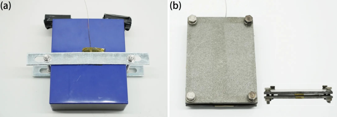 4) 使用低Phi值的夹具对样品热电偶进行固定和压紧。目前常用的夹具有金属肋条(图5a)和云母板(如图5b)等。云母板对电池施加的应力更均匀,但导热性较差,需要设置更长的恒温时间使样品温度达到平衡。