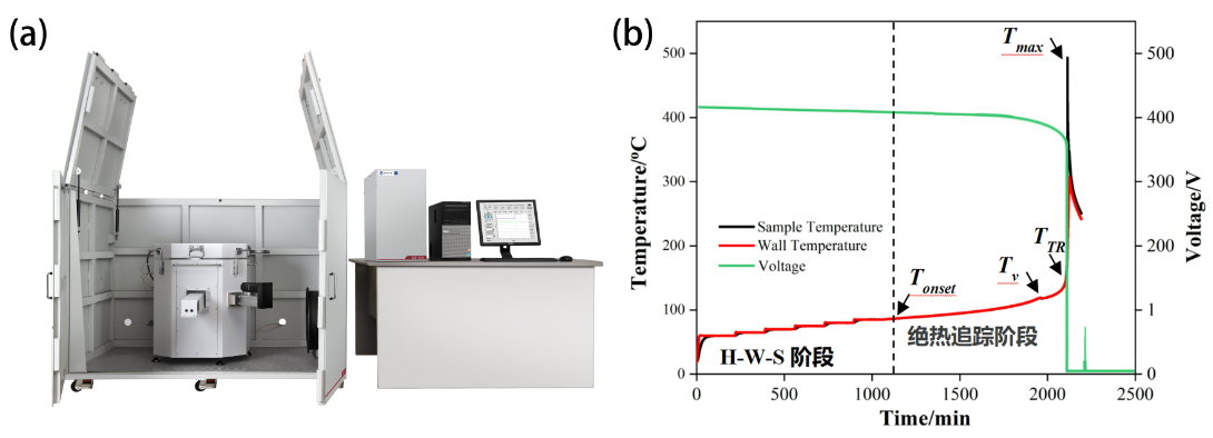 图1 (a)BAC-420A大型电池绝热量热仪与(b)电池绝热热失控典型数据