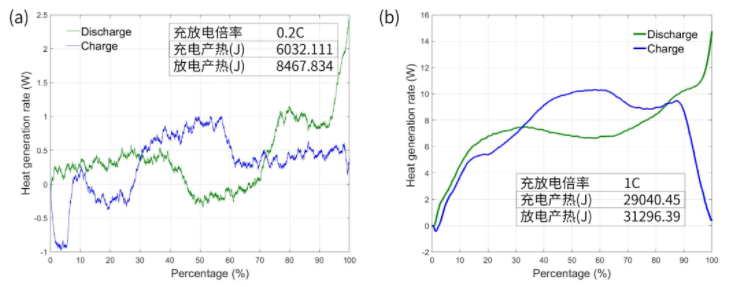 最后,利用50Ah软包电池研究了倍率的影响。如图3a所示,在0.2C倍率下,充放电曲线都存在吸热区间,且两条曲线具有明显的对称性,说明此时电池产热以电极反应热为主,可逆热占比很高;而在1C倍率下,充放电产热充放电曲线对称性减弱,且未出现明显的吸热峰。这是由于在提高充放电倍率情况下,可逆反应热基本保持不变,但极化热和焦耳热等不可逆热显著提高。