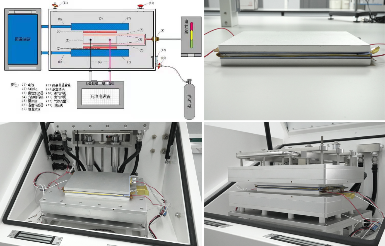 Step1:打开等温量热仪盖板,至下向上依次安装匀热块-加热片-导热硅脂垫-电池样品-导热硅脂垫-加热片-匀热块,如图2,保证各部件之间不产生间隙;