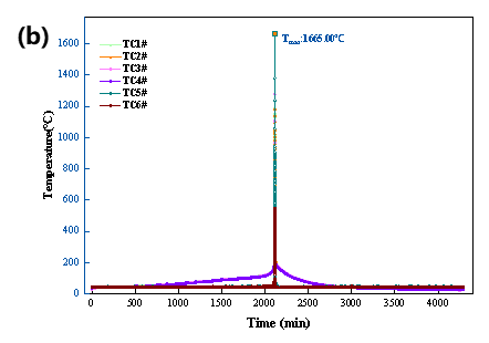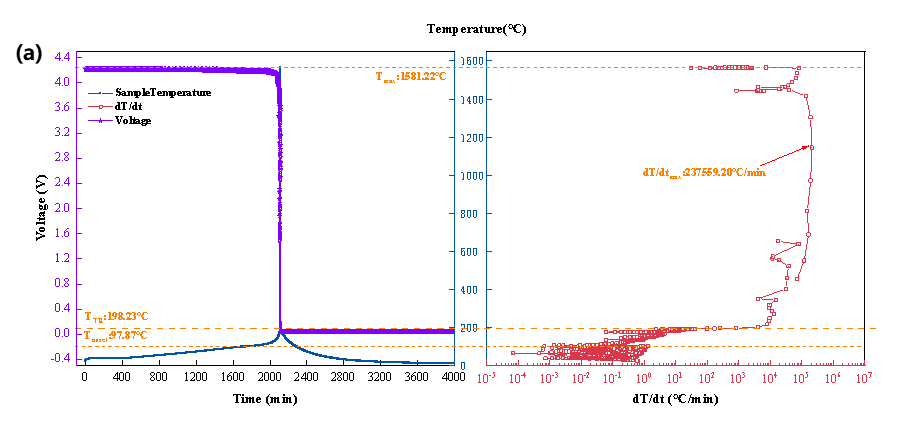 图2 三元九系电池热失控(a)温度&电压-时间曲线、温升速率-温度曲线和(b)附加热电偶温度-时间曲线
