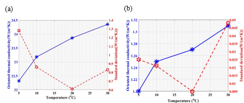 图4 锂电池的(a)面向与(b)纵向导热系数与温度关系图