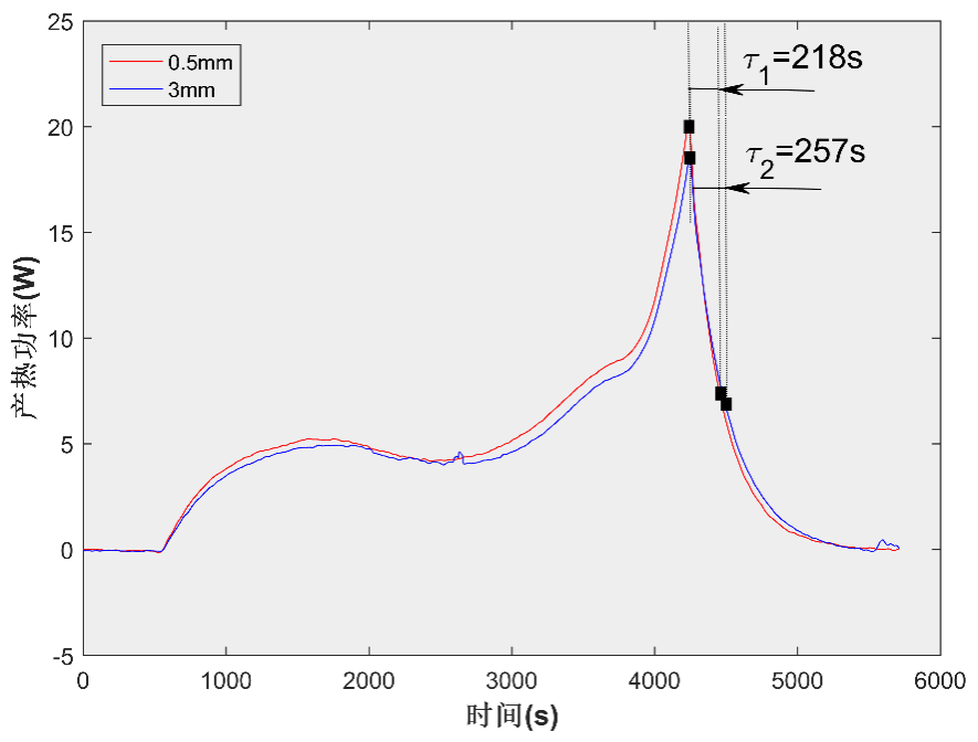 由于厚度不同的电池在容量上难以一致,因此本文选用两款容量不同、大面面积相似、而厚度分别为20mm和80mm的磷酸铁锂电池(#1和#2),进行1C恒流放电实验。理论上放电过程中电池内阻随SOC下降而单调递增,所以放电结束时刻电池产热功率应达到最大值。但等温量热仪测量存在的热滞后效应导致放电结束后热功率曲线需要经过一定时间才能衰减为零。此处定义放电结束后功率从峰值衰减至峰值1/e的时间τ为热滞后时间常数。τ的大小与电池至加热片之间非稳态传热的时间常数相关。如图2所示,对于厚度为80mm的#2电池,τ₁=1134,明显大于#1电池的计算结果(τ₂=218),说明电池厚度增加会显著影响电池产热测量的动态响应,这可能是由于电池热容和内部热阻都与厚度正相关。