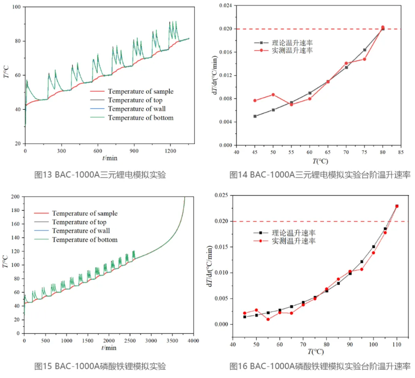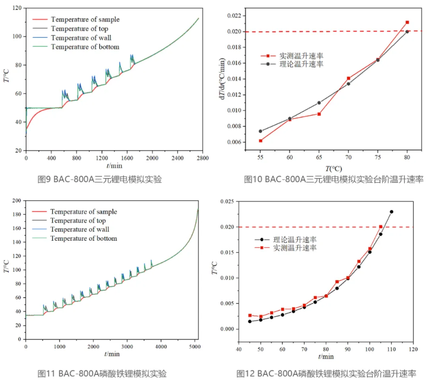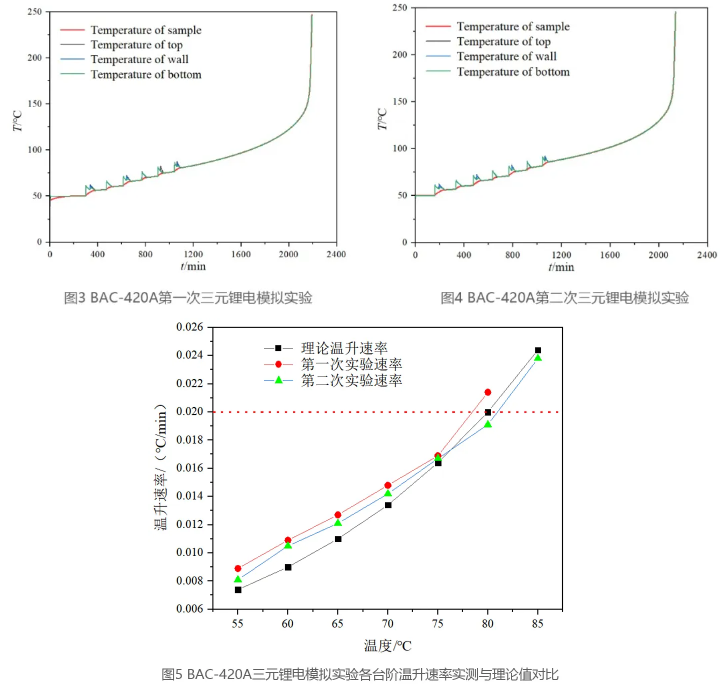 对于磷酸铁锂模拟实验,标样的理论Tonset温度为106.7℃,两次实验的Tonset检出台阶均为110℃,符合预期。上述实验结果均满足一个台阶步长(5℃)的误差范围。实验中各台阶实测温升速率与理论值偏差均在±0.003℃/min内。