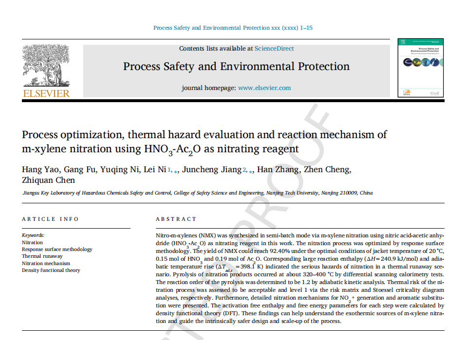 南京工业大学倪磊教授团队在 Process Safety and Environmental Protection 期刊发表题为 Process optimization, thermal hazard evaluation and reaction mechanism of m-xylene nitration using HNO3-Ac2O as nitrating reagent 论文,该成果由国家自然科学基金项目(No. 21927815, 52334006, 52274209)等支持。