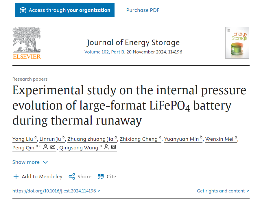中国科学技术大学王青松教授团队在《Journal of Energy Storage》(IF:8.9)期刊发表题为《Experimental study on the internal pressure evolution of large-format LiFePO4 battery during thermal runaway》论文。该研究由中国科学技术大学火灾科学国家重点实验室、合肥国轩高科动力能源有限公司和合肥工业大学电气与自动化工程学院等机构联合支持,重点探讨了大容量磷酸铁锂电池在热失控过程中的内部压力演变机制。