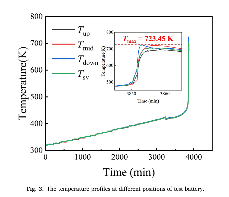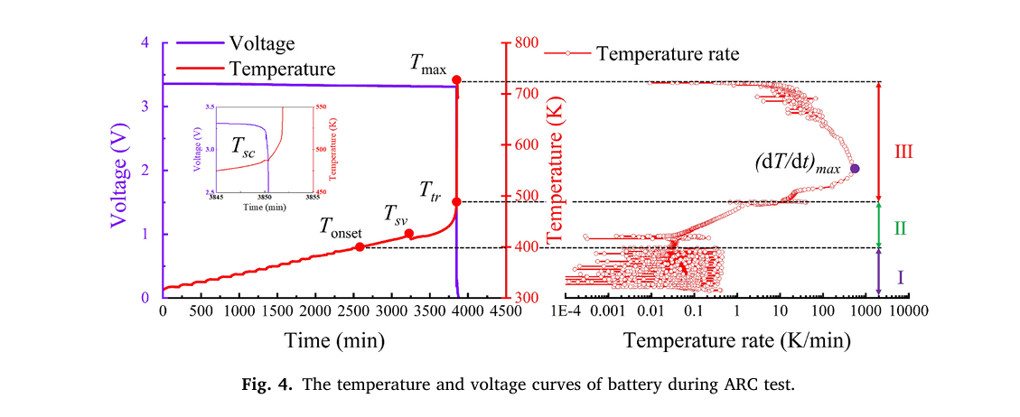 利用BAC-420A的HWS模式开展热失控测试,模拟绝热环境并记录温度、电压等数据。确定了自放热起始温度(Tonset)、热失控起始温度(TTR)和热失控最高温度(Tmax)等关键温度点,实验将热失控过程分为三个阶段,明确了各阶段的反应和温度变化特点。