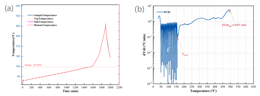 本次实验采用BAC-90A小型电池绝热量热仪的HWS模式测试纤维锂电池热失控过程。该实验模式能够准确测量得到锂电池自放热起始温度(T1)、热失控起始温度(T2)等关键电池热安全参数。