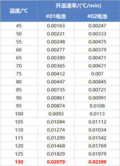 当温度达到130℃时,两个模组的台阶温升速率均达到0.02℃/min(表3),此时判定模组中单体电池的自放热开始;因此依据该参数设定该款模组的一级安全报警温度为130℃,能对储能系统做出有效的预警。
