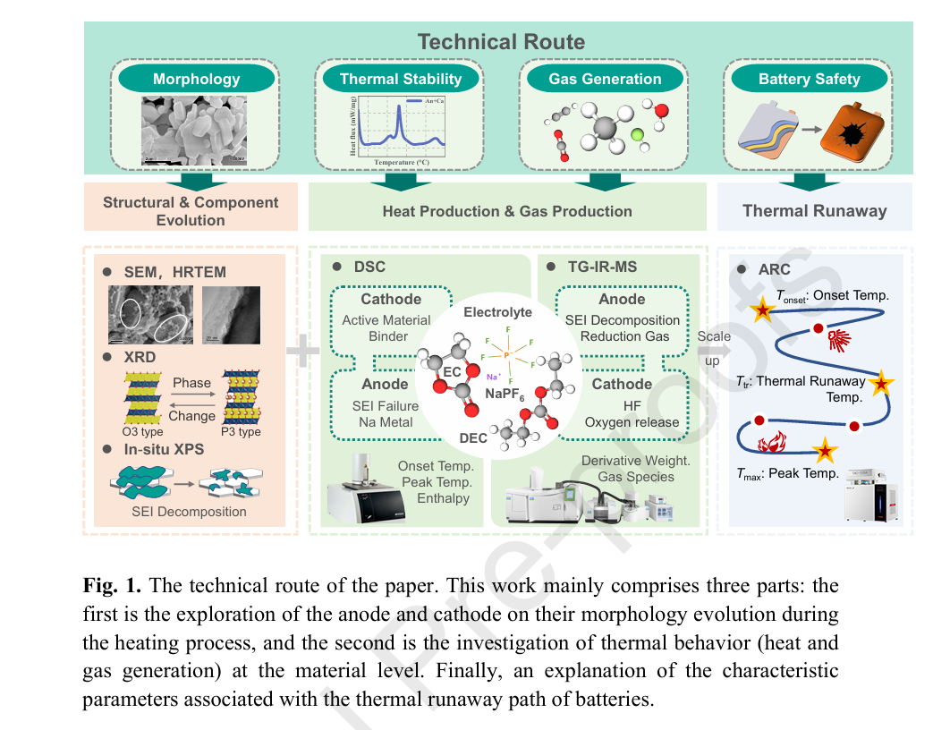 为实现对NFM/HC材料组合多层次的热安全理解,研究采用了特定的技术路线对钠离子电池从材料到电池层级的热稳定性进行深度剖析。具体包括: