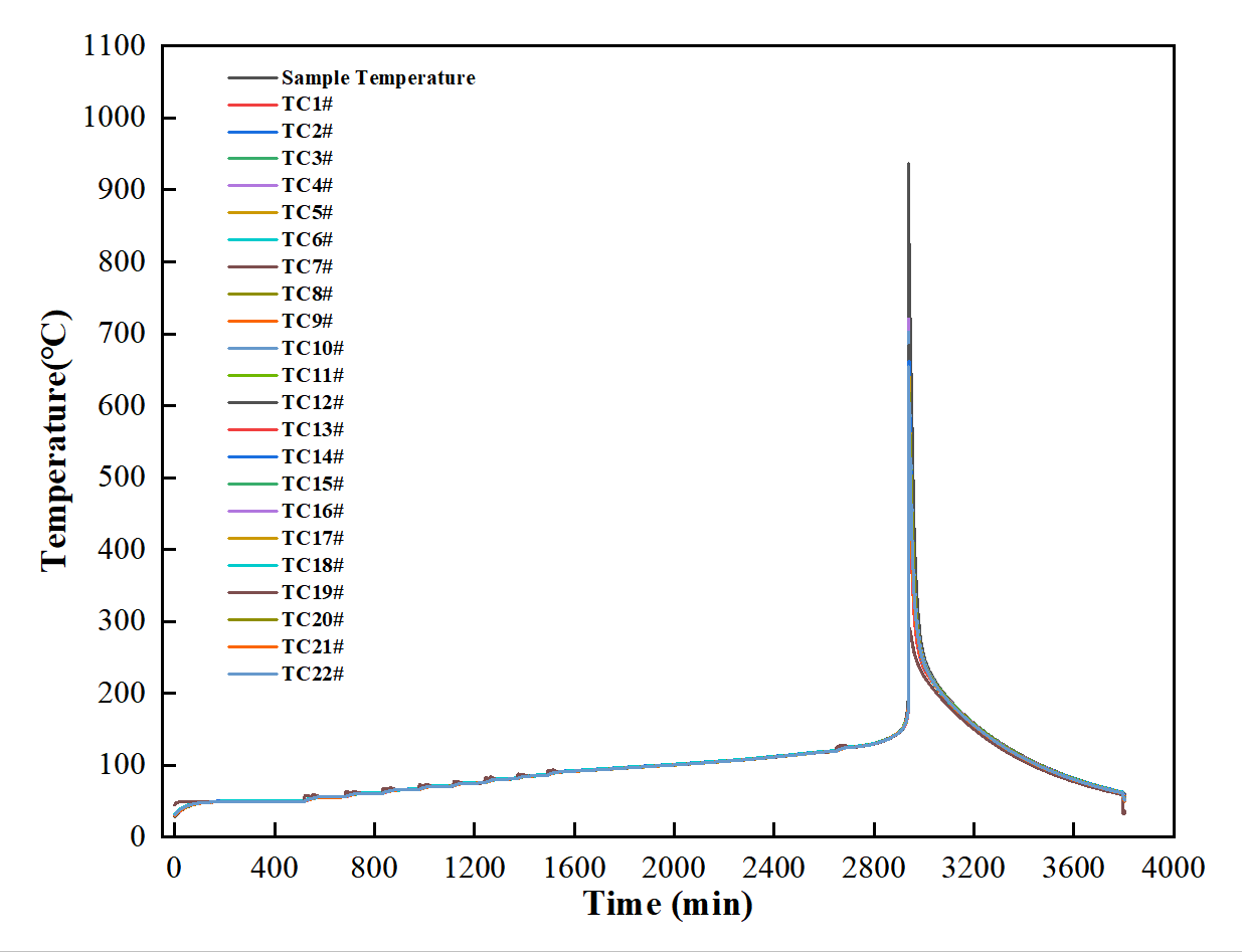 浙仪应用研究院采用密闭型大型电池绝热量热仪BAC-800B,借助多通道测温法兰和数据采集仪进行多点温度测试,精准获取到电池热失控过程完整的温度变化曲线,清晰地呈现出电池自放热后各个点的温度变化情况,并准确确定了电池热失控点位及真实最高温度等关键参数。