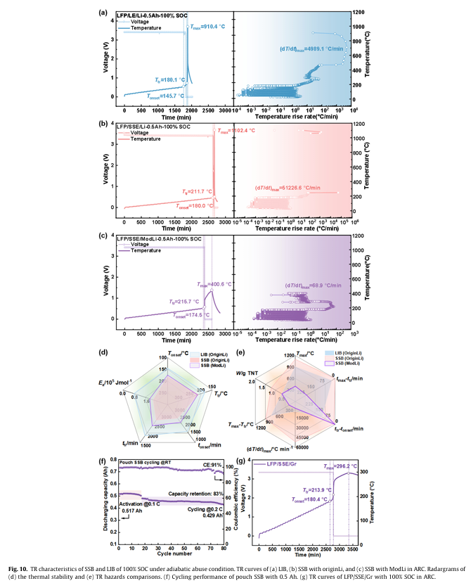 结果表明,在绝热加热热失控实验中,固态锂金属电池(SSB)的自发热起始温度相比液态电池(LIB)滞后超过30℃,热失控出发温度也随之提升。并且最高温度以及最高温升速率的降低也证实了固态锂金属电池(SSB)较低的热失控危害性。