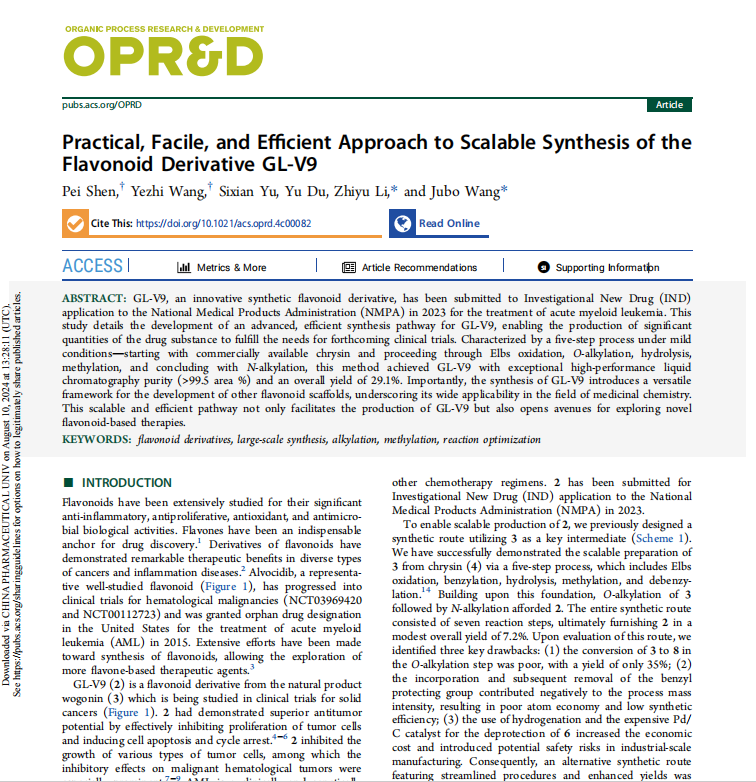 中国药科大学李志裕教授团队在Organic Process Research & Development期刊发表题为《Practical, Facile, and Efficient Approach to Scalable Synthesis of the Flavonoid Derivative GL-V9》的研究论文,该成果由中国药科大学药学院药物化学系支持。