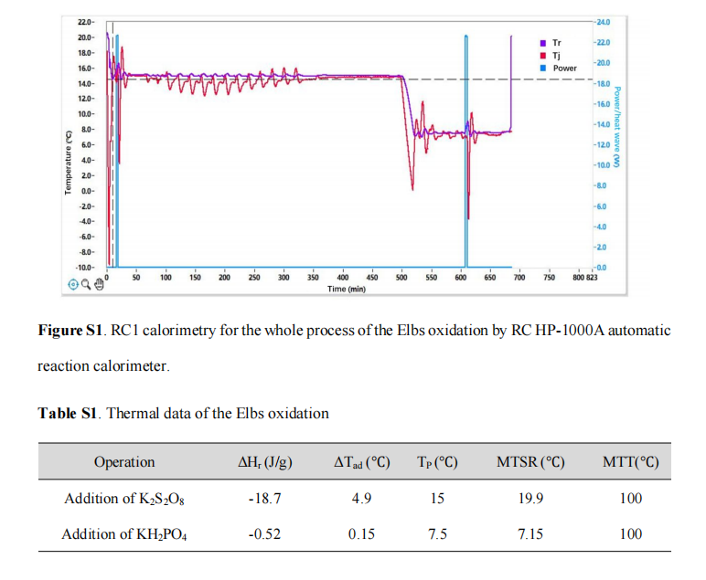 Elbs氧化反应是GL-V9合成的首个关键步骤。研究团队利用RC HP-1000A自动反应量热仪,成功获取了该反应过程中的比放热焓(ΔHr)、绝热温升(ΔTad)、失控最高温度(MTSR)等核心热风险参数。基于这些数据,不仅验证了Elbs氧化工艺的安全性,更为该工艺冷却系统的选型及操作规范的制定提供了定量依据。