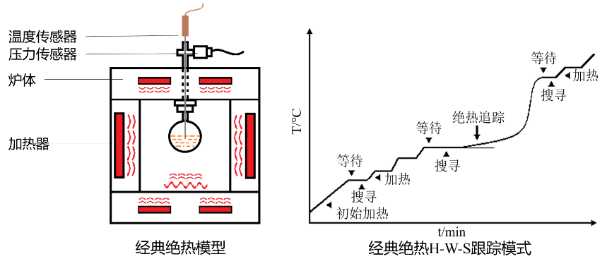 绝热加速量热仪的经典工作模式为“加热—等待—搜寻”(H-W-S)模式,工作前可设置实验起始温度、终止温度、斜率敏感度、加热幅度和等待时间等参数。“加热”阶段,量热仪的温度按设定的加热幅度升高;“等待”阶段,控制器通过比较样品室温度与绝热炉各个区域的温度,保持绝热炉内的温度处于均匀平衡状态;“搜寻”阶段,若检测到样品升温速率大于设置的阈值(如0.02℃/min),则进入绝热追踪阶段,通过程序控温保持样品池四周的绝热环境;否则,量热仪自动进入下一个“加热—等待—搜寻”流程。
